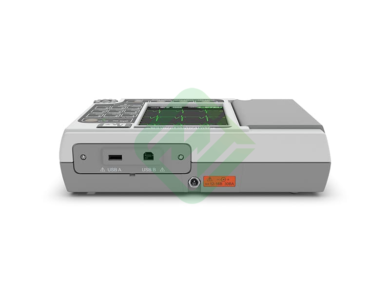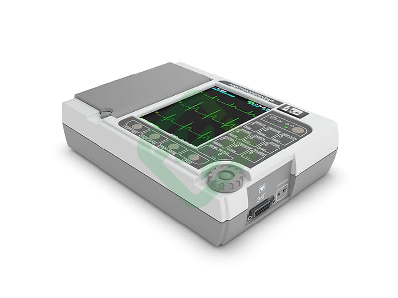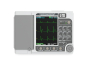 - Цветной сенсорный ЖК-дисплей (141 мм) позволяет управления работой электрокардиографа и отображает параметры режима съема, ЭКГ, ЧСС, состояние аккумулятора, обрыв электродов, фильтры, значения усиления, скорости, формат отведений, виды анализа ЭКГ для удобного отслеживания рабочего статуса прибора