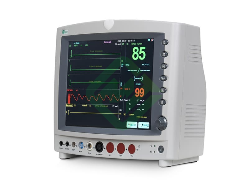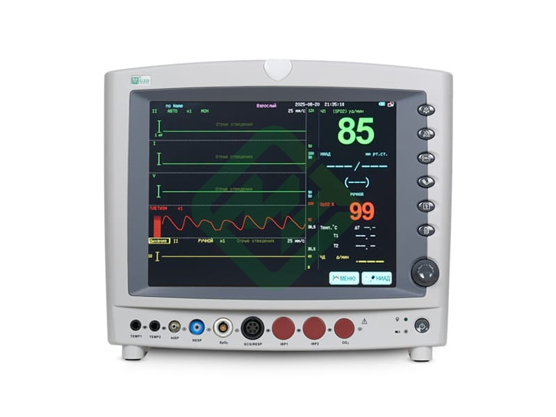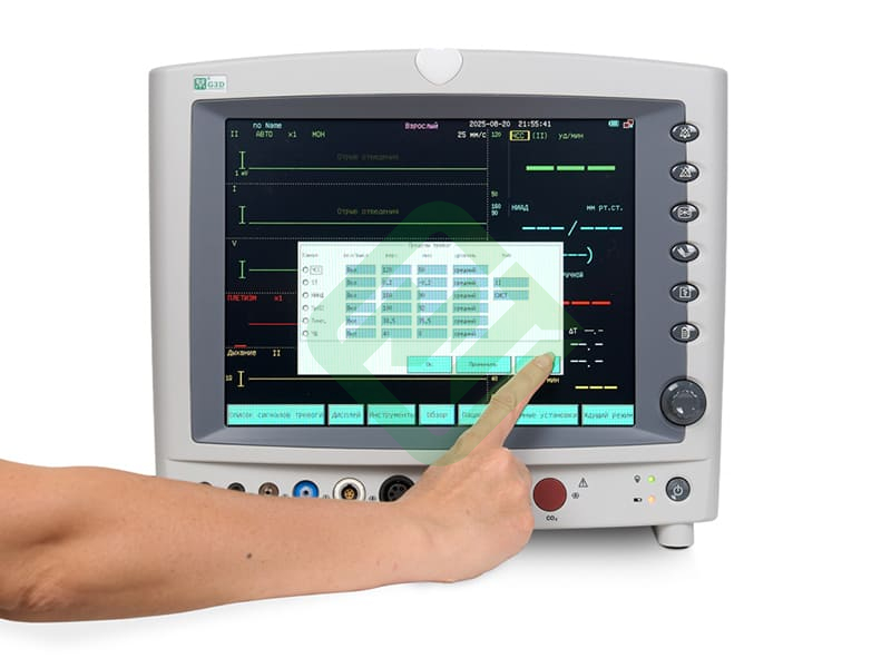 - Монитор G3D, с поверкой измеряет жизненно важные параметры пациента: ЭКГ, ЧСС, RESP, НИАД, SpO₂, ЧП, Т°, ЧД