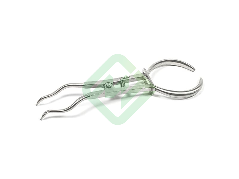 - Фиксатор свободно передвигается по ручкам щипцов между их изгибом и центральным фиксирующим винтом для снижения нагрузки при установке кламмера
