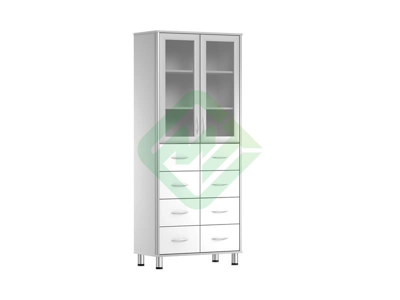 - Верхнее отделение с 2-мя полками, закрытое 2-мя стеклянными дверками в рамке из МДФ-профиля цвета алюминий, и нижнее — 8 ящиков на роликовых направляющих с нагрузкой до 10 кг