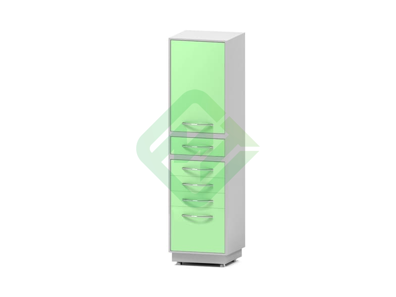 - Верхняя секция с дверкой и 2-мя полками, в центре 1 ящик и в нижней располагаются 5 выдвижных ящиков на шариковых направляющих
