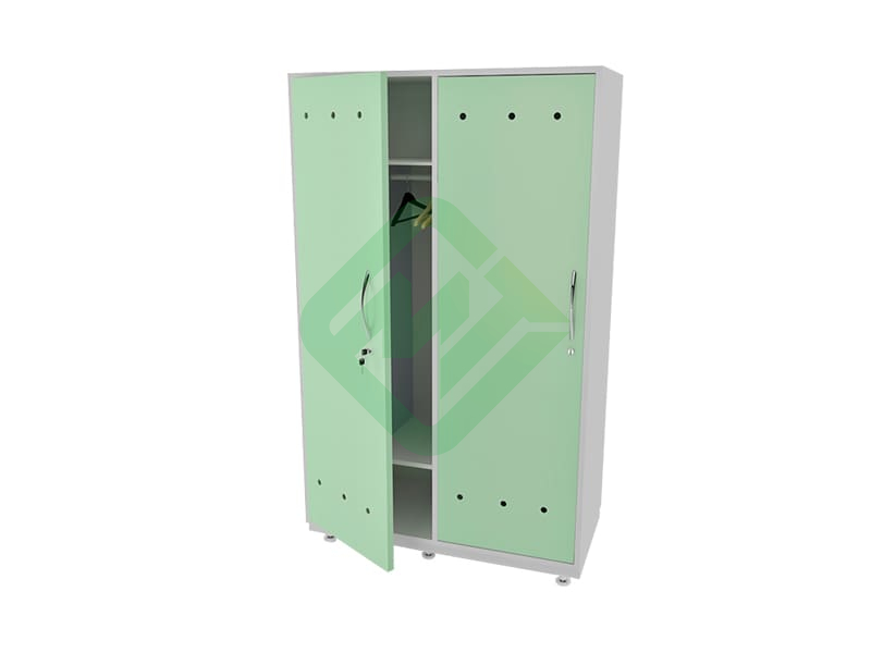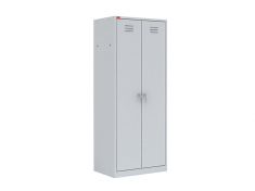 - Шкаф имеет 2 отделения, каждое с распашной дверкой, закрывающейся на замок, внутренними нижней и верхней несъемными полками, штангой для вешалок и вертикальной разделительной шторкой