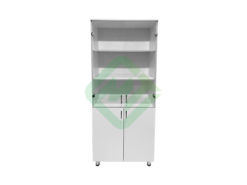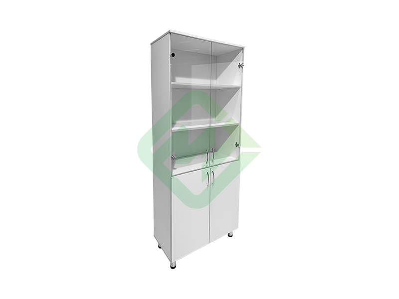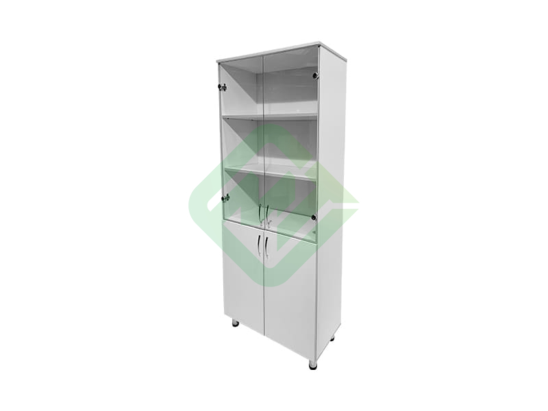 - Изготовлен из ЛДСП 16 мм белого цвета RAL 9010, торцы облицованы кромкой ПВХ 2 и 0,4 мм, фасад — прозрачное стекло 5 мм и ЛДСП с кромкой 2 мм светло-серого RAL 7047