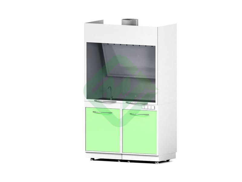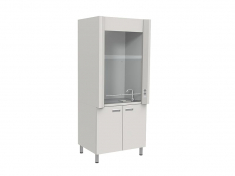 - Шкаф имеет тумбу с 2-мя отделениями с распашными дверками: одно отделение под мойку, другое с 2-мя металлическими полками для хранения лабораторной посуды и реактивов