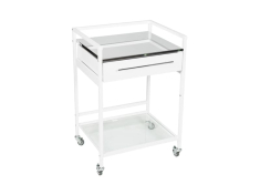 - Имеет полку (столешницу) из стекла, ящик из окрашенного металла и полку (без бортиков) под ящиком из нержавеющей стали
