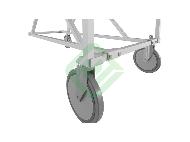- Основание установлено на 4 поворотных самоориентирующихся колеса из немаркой серой резины, 2 с индивидуальным тормозом