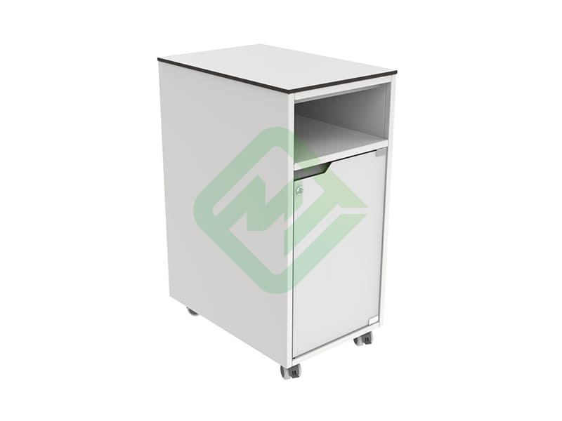 - Тумба установлена на колесные опоры Ø50 из полипропилена серого цвета, 2 передних колеса снабжены тормозом